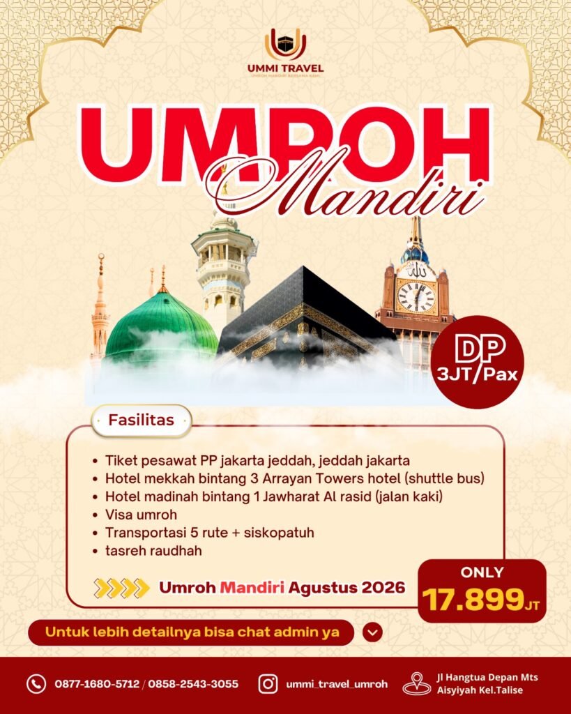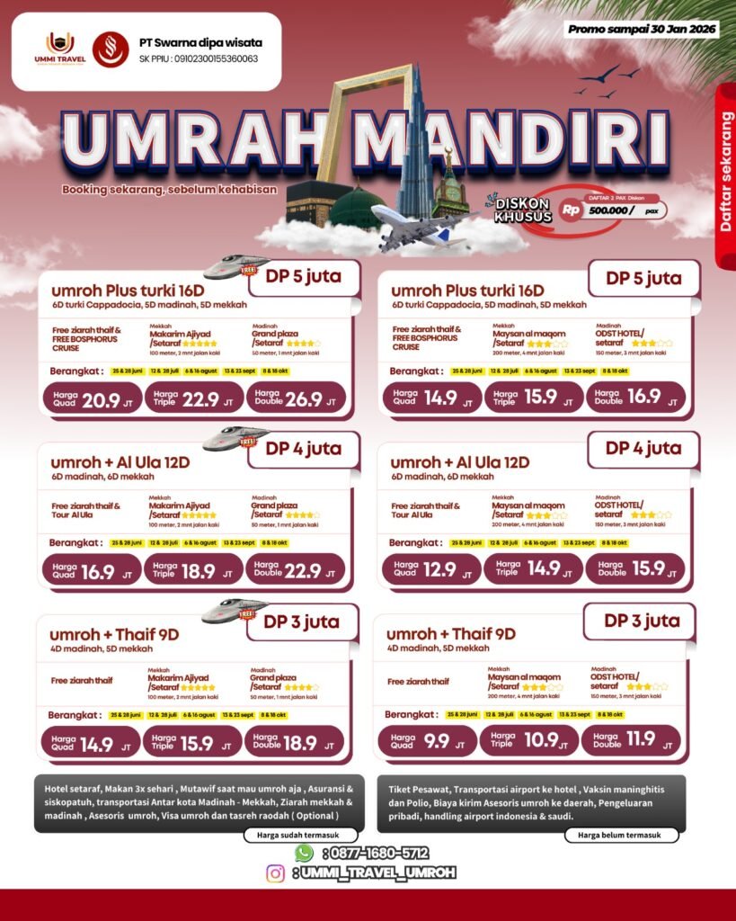 Umroh Mandiri merupakan suatu program untuk membantu kamu agar bisa umroh dengan budget terbatas, namun tetap bisa beribadah dengan nyaman. Cukup cari dan beli tiket pesawat susuai tanggal keinginanmu dan sisa nya serahkan sama UMMI TRAVEL untuk membantu mu!